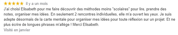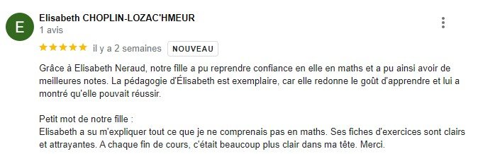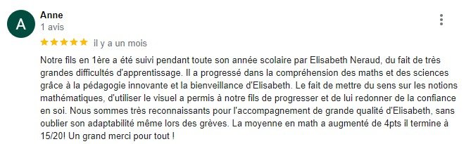Grâce à Elisabeth, ma fille a repris confiance en elle, a acquis une méthode et a remonté ses notes dès qu'elle a commencé.