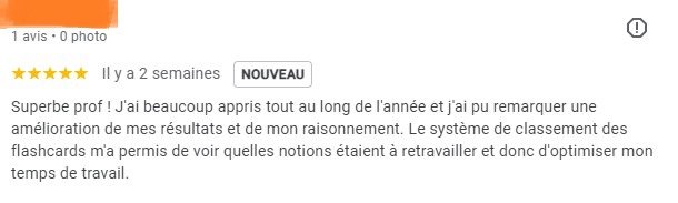J’ai participé à des ateliers pour le bac de maths. C’était très constructif, les bases ont été revues ! Ça m’a beaucoup aidé dans mes révisions. Personne pédagogue, avec des explications claires. De plus, les flashcards utilisées sont super pour revoir toutes les notions. Je vous recommande fortement !!»