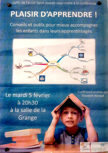 - Février 2019 : conférence avec l’APEL de l’école St Joseph de Cintré : Plaisir d’apprendre !