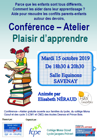 - Octobre 2019 : conférence / atelier "Plaisir d'apprendre" à Savenay (FCPE et Amicale Laïque)