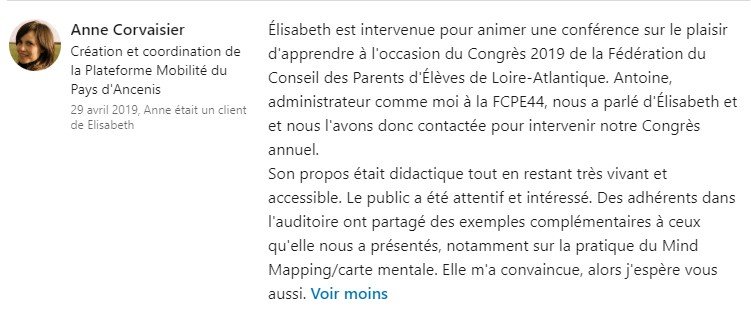 Notre fils qui est en 4ème présentait des difficultés au niveau de la concentration, de l’organisation et ne semblait pas travailler efficacement. La relation aux devoirs et avec nous était très conflictuelle. Il y a 3 mois nous avons démarré une prise en charge à domicile avec Elisabeth. Rapidement il a intégré l’utilisation de « cartes mentales », et a également montré davantage de motivation et d'autonomie dans son travail, ce qui s’est traduit par de meilleures notes .(...)